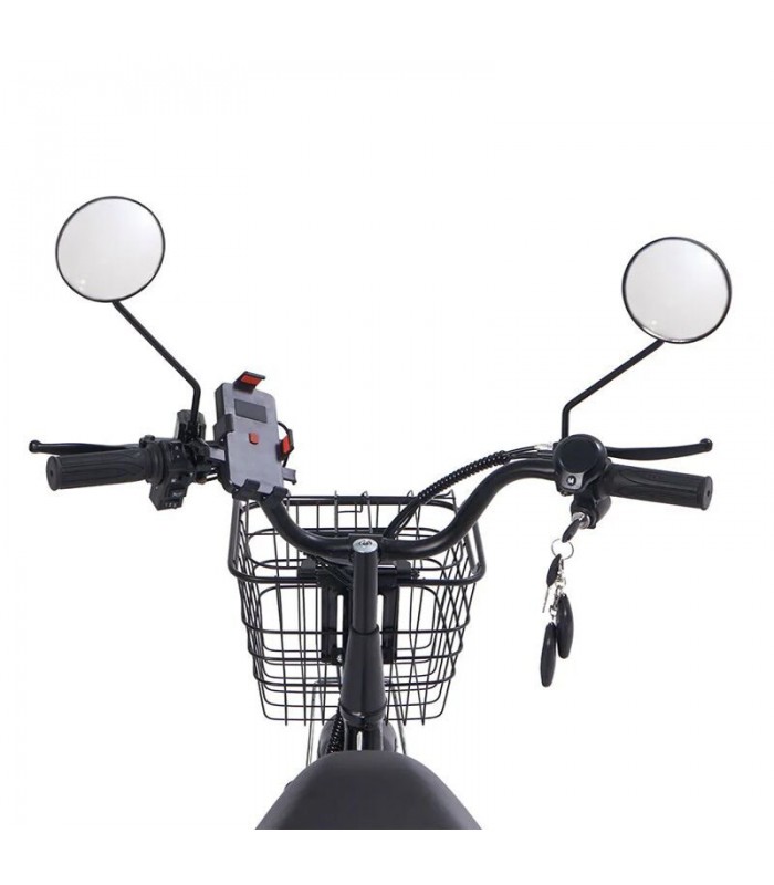 Большие 20-дюймовые надувные колёса и двухподвесная качественная амортизационная система делают езду по неровной дороге более плавной. На руле есть информативный дисплей, на нём вы сможете отслеживать уровень заряда, пройденное расстояние и остаток заряда батареи. С зеркалами заднего вида вы всегда сможете увидеть, что происходит позади вас, не отвлекаясь от вождения. Вес элекровелосипеда всего 33 кг.