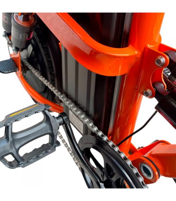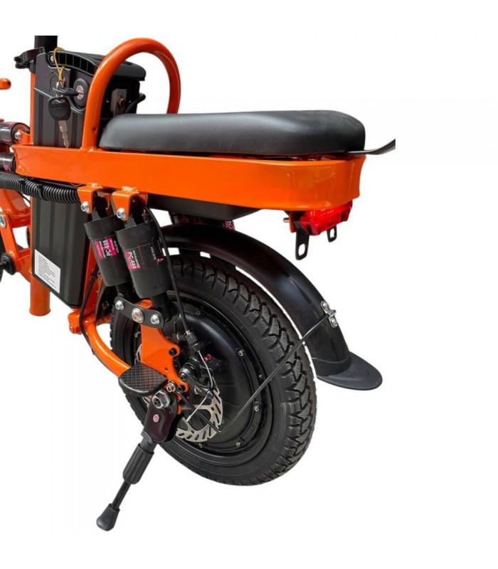Благодаря двигателю мощностью 300 Ватт электрический велосипед развивает скорость до 40 км/ч без педального хода. Передняя амортизационная вилка и задний амортизатор эффективно поглощает вибрации при езде по неровной дороге. Пневматические 14-дюймовые колёса хорошо адаптированы к городским дорогам. Безопасная остановка осуществляется при помощи дисковой механической тормозной системы.