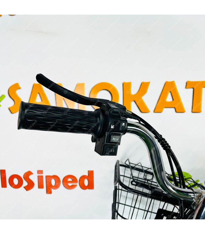Электровелосипед оснащен хорошей передней оптикой, ярким задним габаритным огнем со встроенными поворотниками. Так же имеется подрулевой переключатель трех передач электромотора. Передачи ограничивают максимальную скорость на выбранном режиме, 1-самый медленный режим, а 3 – самый быстрый.