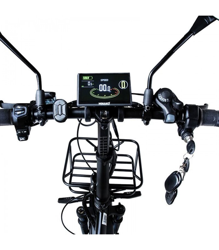 Минако Ф11 Про оснащён дисплеем на руле. С его помощью вы сможете отследить скорость, пройденное расстояние, остаток заряда и выбранный режим езды. Электронный велосипед по достоинству оценят курьеры благодаря корзине спереди и багажнику сзади. Зеркала заднего вида позволят контролировать ситуацию на дороге. Семь механических скоростей сделают поездку намного легче при выключенном моторе.