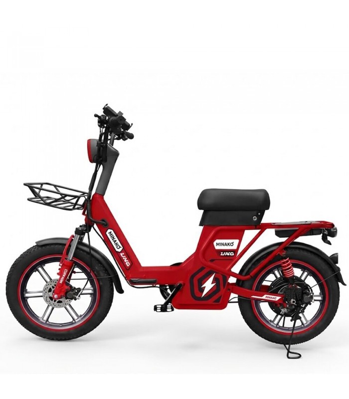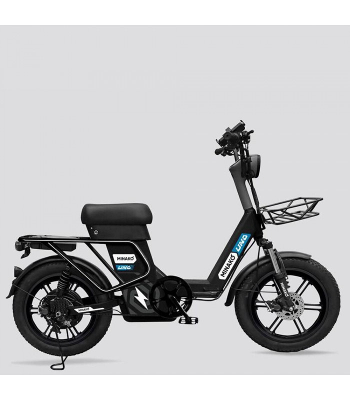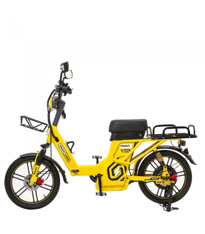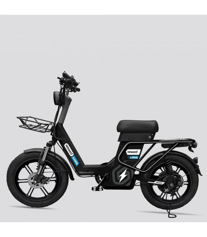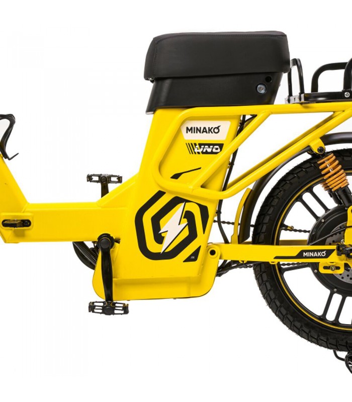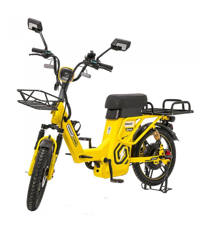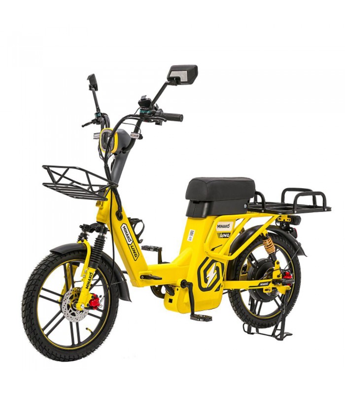 Электровелосипед Minako UNO 21ah прекрасный выбор для курьеров и работников доставки. Благодаря корзине спереди и грузовому багажнику сзади вы сможете перевозить дополнительный груз. Не складная рама из прочной стали позволяет выдерживать нагрузку до 180 кг. Вес электрического велосипеда всего 59 кг, а габариты в сборе: 160 х 116 х 64 см.