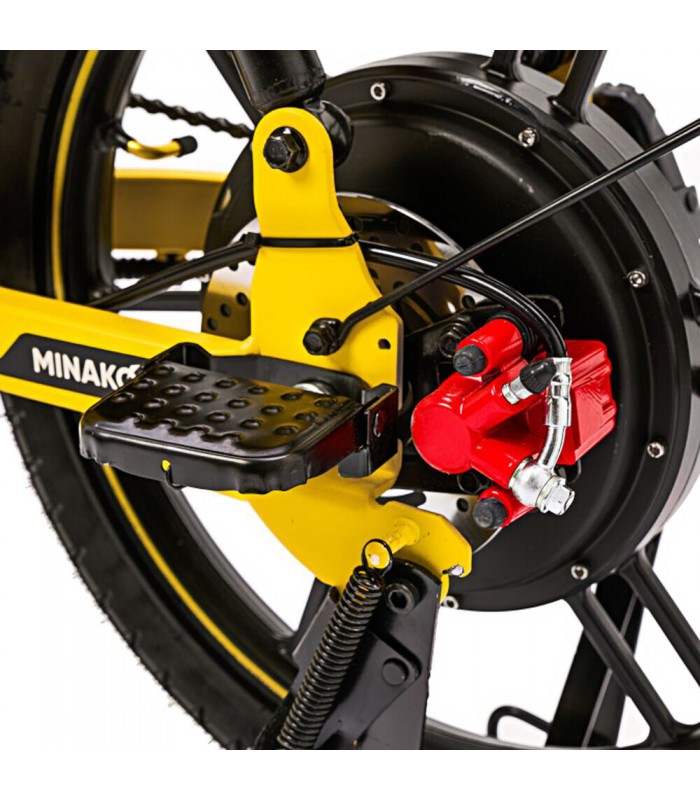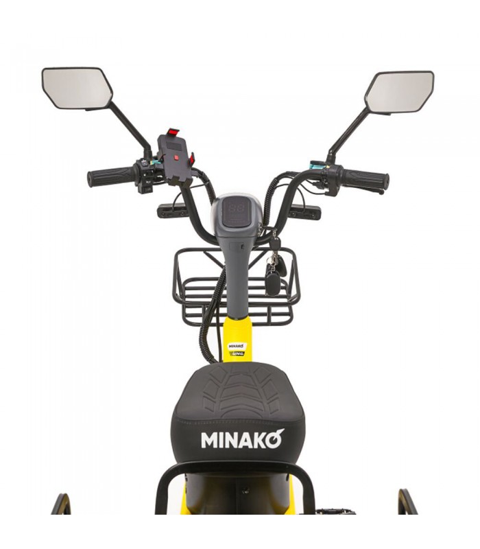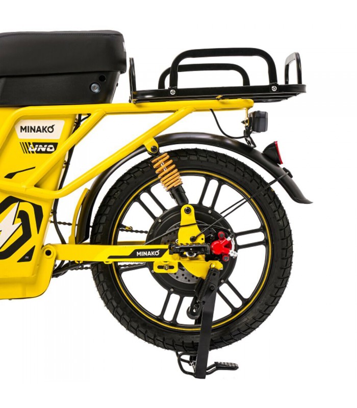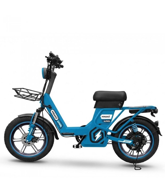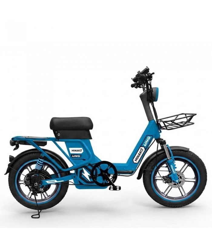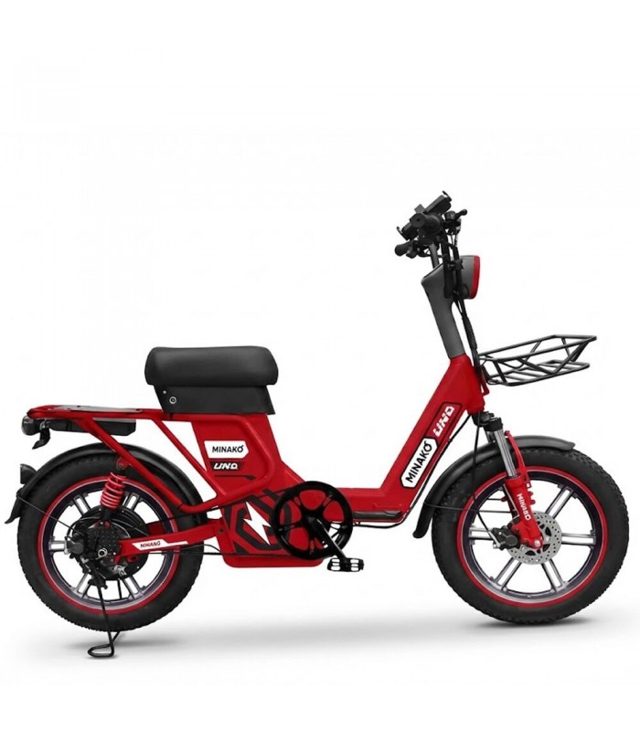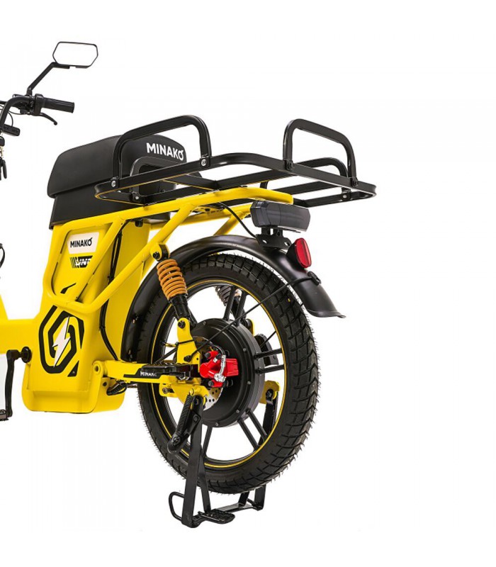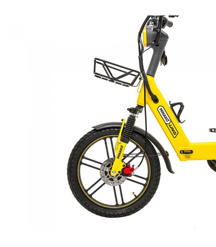 Электровелосипед Minako UNO 21ah прекрасный выбор для курьеров и работников доставки. Благодаря корзине спереди и грузовому багажнику сзади вы сможете перевозить дополнительный груз. Не складная рама из прочной стали позволяет выдерживать нагрузку до 180 кг. Вес электрического велосипеда всего 59 кг, а габариты в сборе: 160 х 116 х 64 см.