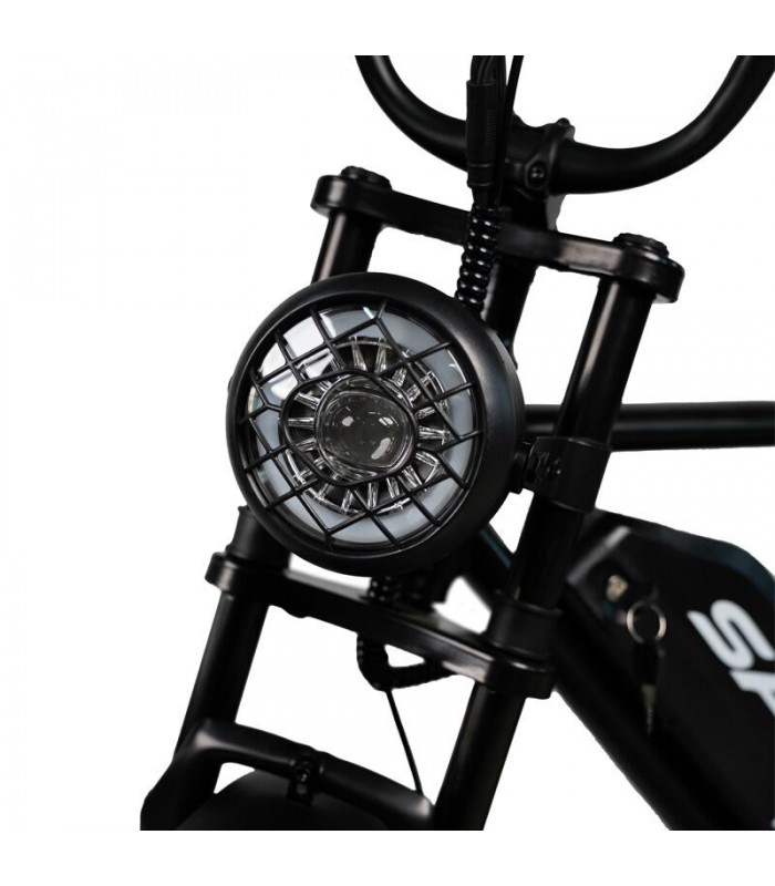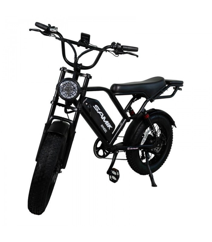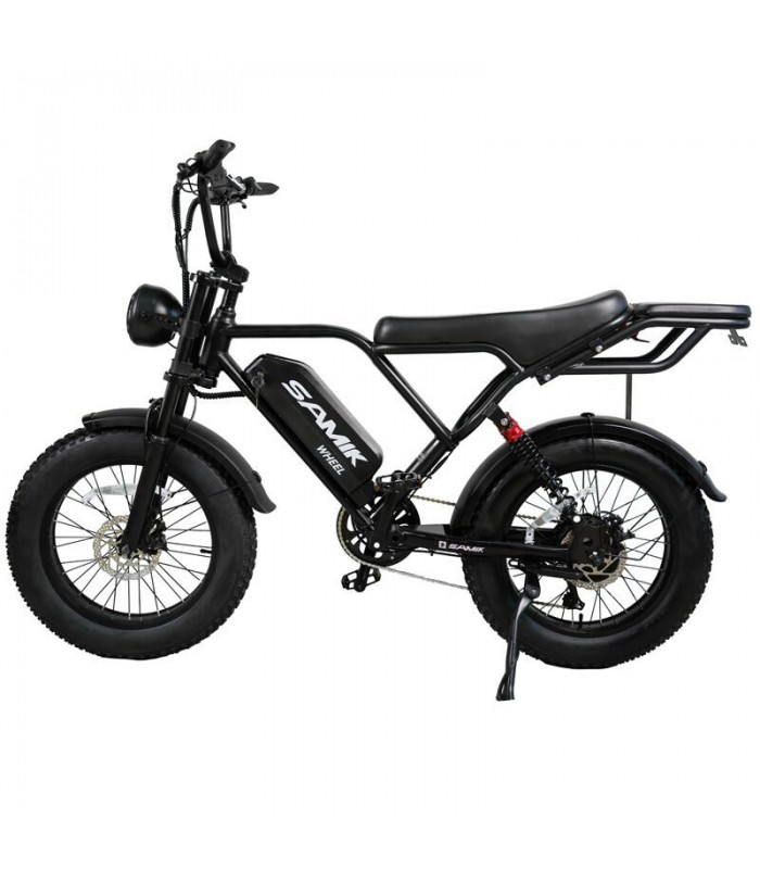Электрофэтбайк SAMIK BK 20 с широкими пневматическими 20-дюймовыми колёсами и качественной амортизации спереди и сзади отлично подходит для города и пересечённой местности. Мощный мотор на 750 ватт позволит разгоняться на электровелосипеде до 50 км/ч без педального хода. Литий-ионный аккумулятор на 48V 18Ah (864Wh) даст возможность проехать до 50 км на одном заряде. Для комфортного передвижения в вечернее время на электрическом велосипеде установлены яркая фара спереди и стоп-сигнал сзади.