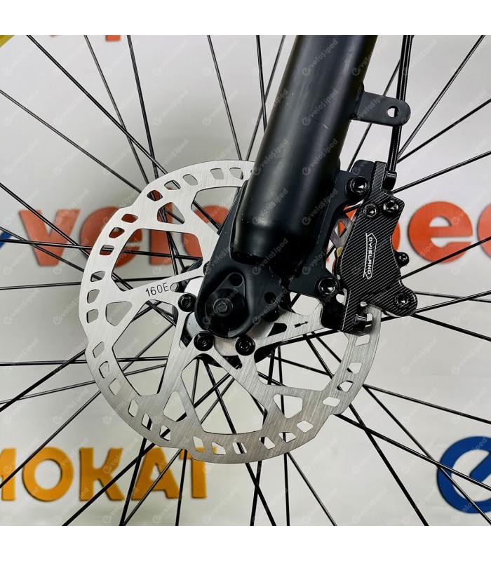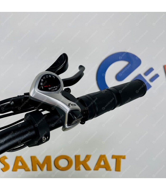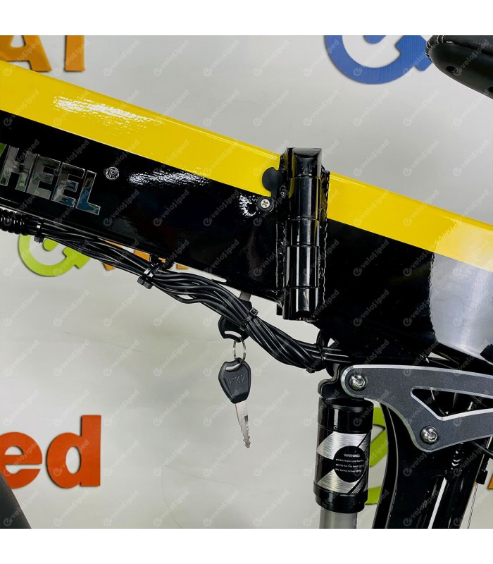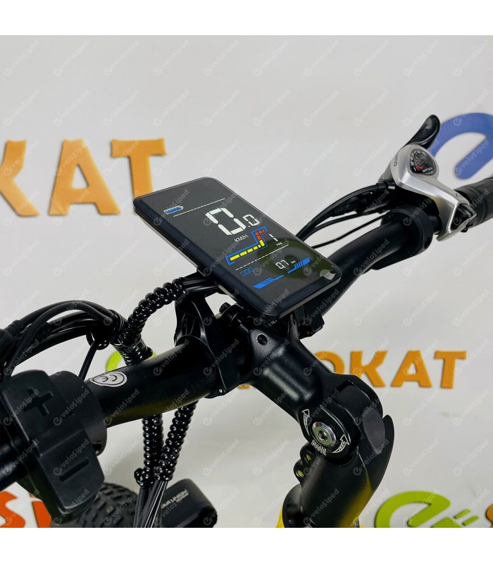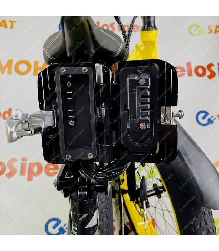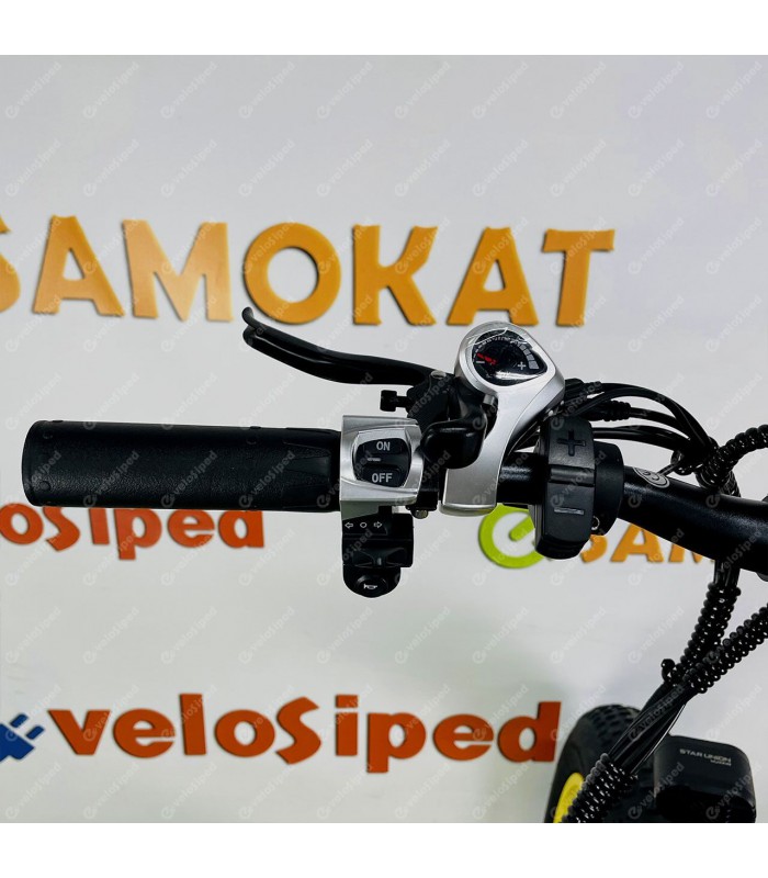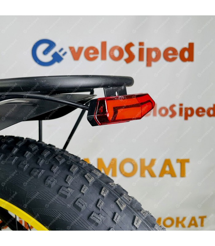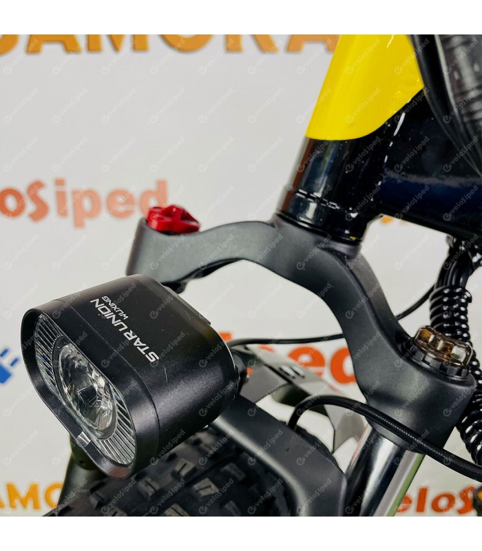 Дополнительно имеется отличная подвеска на задней и передней стойке. При этом передняя амортизация сделана в виде мотовилки с возможностью регулирования жёсткости хода. Колёса 26 дюймов, большие и широкие, это колёса фэтбайка для повышенной проходимости по плохой дороге типа грязи или песка. Имеется фара, установленная на руле.