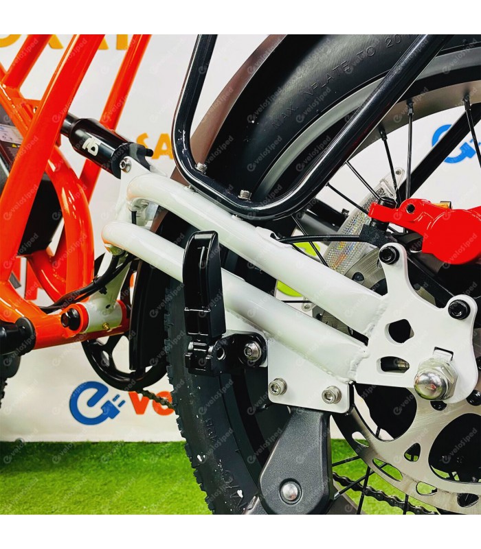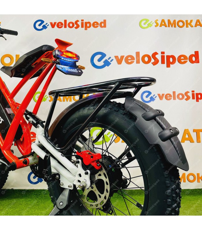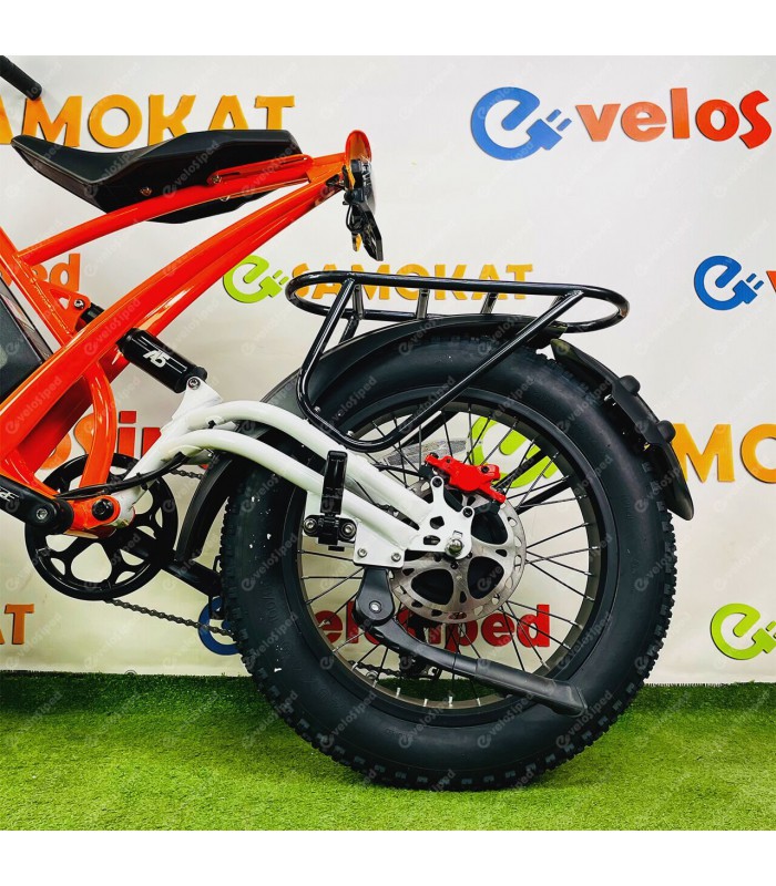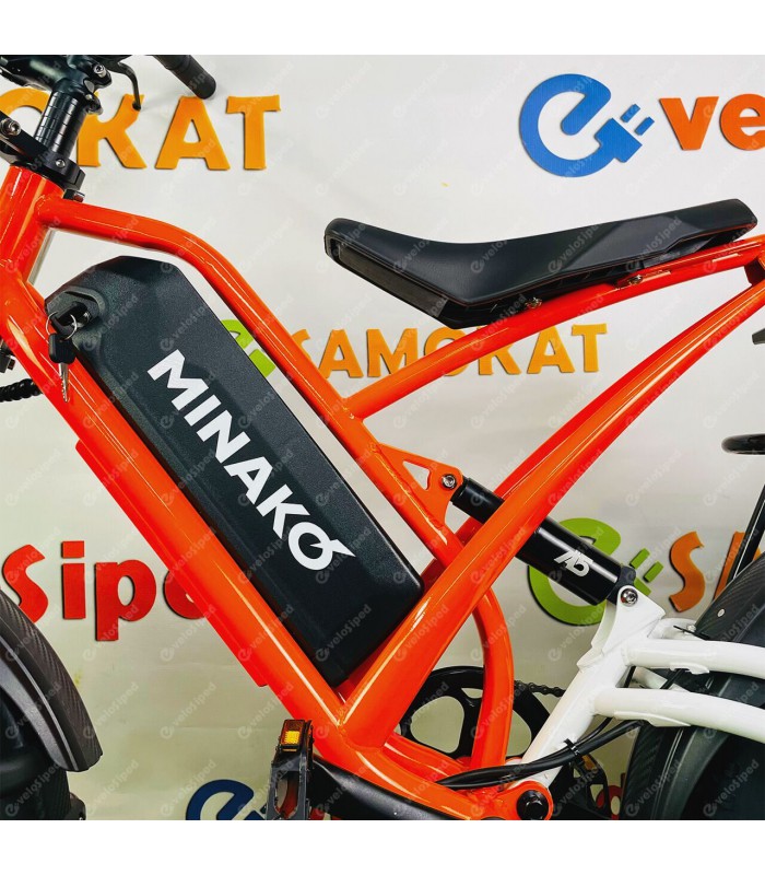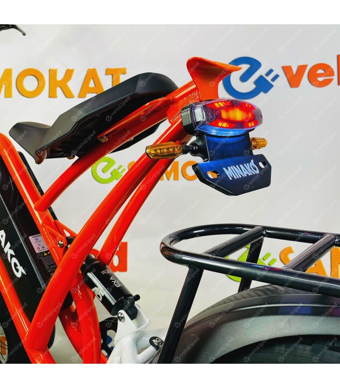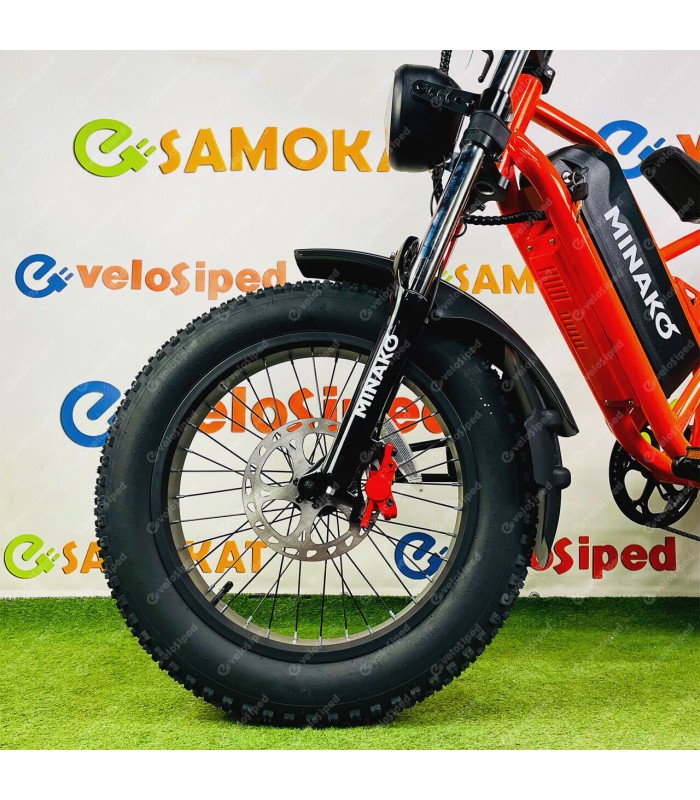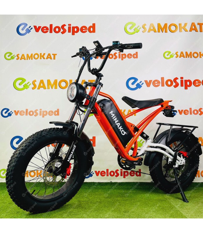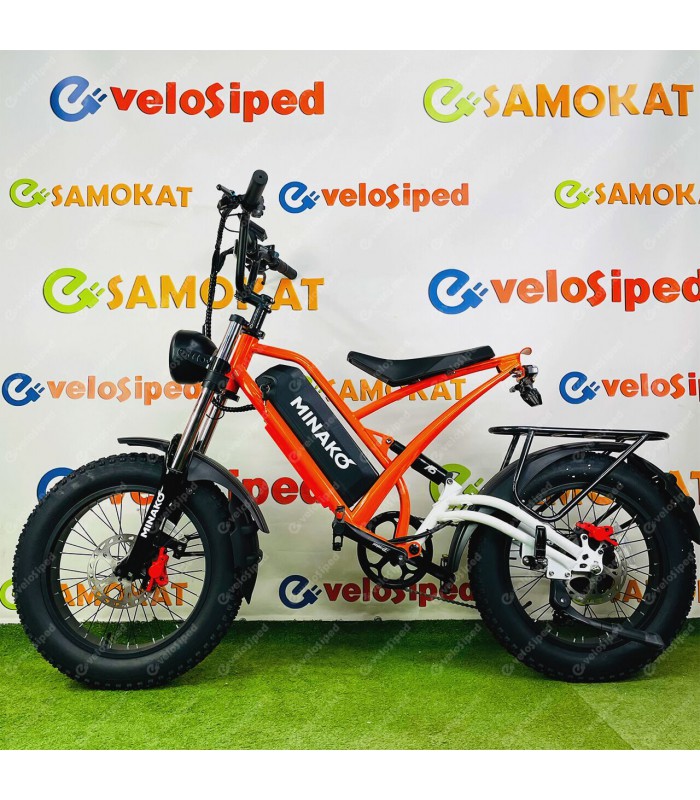 Минако ФОКС оборудован мощным мотором на 750 ватт, с ним вы сможете взбираться на самые крутые подъёмы и разгоняться до 50 км/ч. Вы сможете кататься на электрофэтбайке продолжительное время без усталости за счёт удобного сиденья. В задней части электровелосипеда есть вместительный багажник для перевоза пассажиров или вещей.